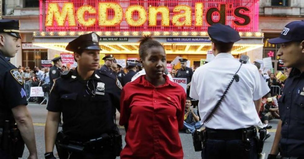 Hundreds of fast-food workers and their supporters were arrested in cities across the country on Thursday as they stood up (and in some cases sat down) as they demanded a $15/hour minimum wage, the right to unionize, and better working conditions across the industry.
