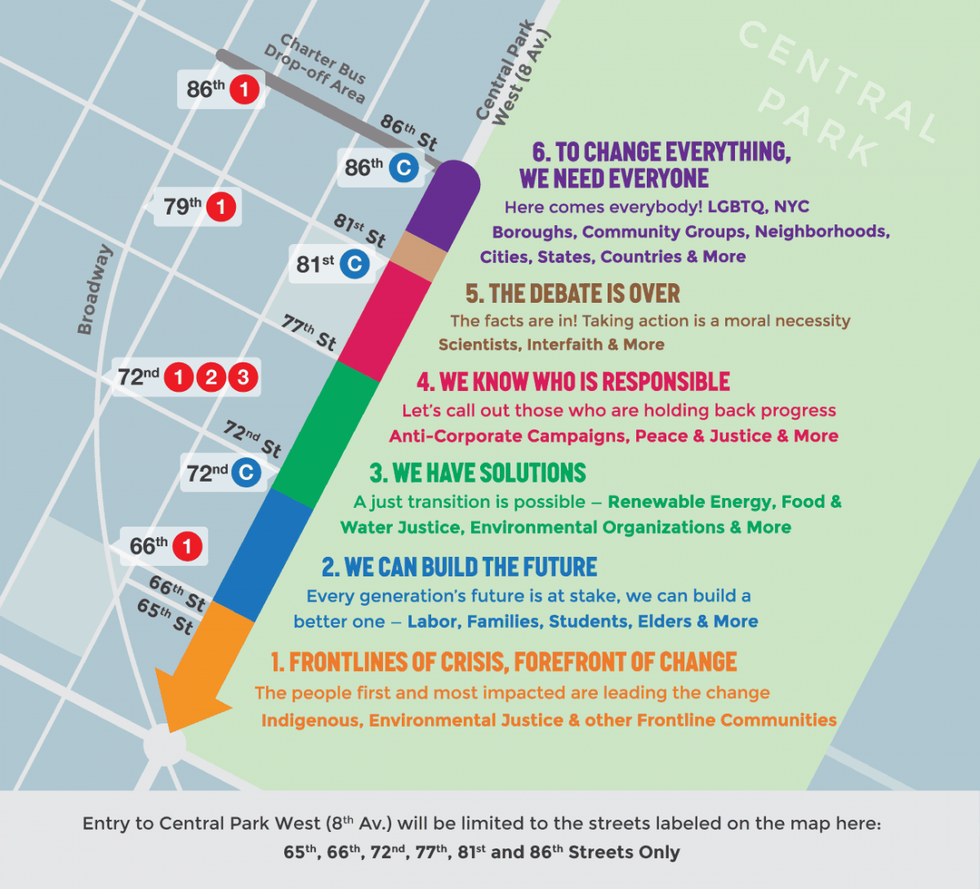In addition, the march itself will been organized into six sections, or themes, all of which present a particular viewpoint, or message, related to the climate crisis. The sections include: Frontlines of Crisis, Forefront of Change; We Can Build the Future; We Have Solutions; We Know Who Is Responsible; The Debate Is Over; and To Change Everything, We Need Everybody--and will be organized according to this map: