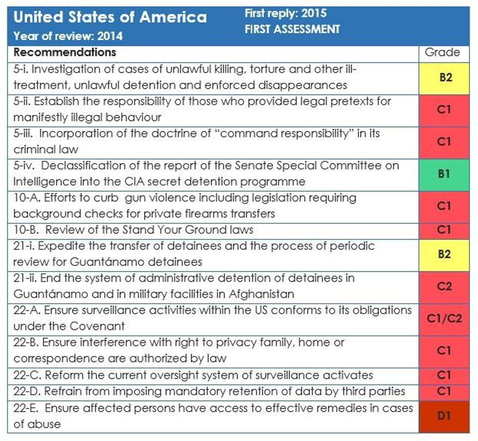 The agency delivers grades that range from "A" the "E." The U.S. score for 2014 was summarized in the following graphic, compiled by CCPR. Ploton explained: "There is only one B1 grade, which means substantial action was taken. C1 means that there was no implementation, and C2 is worse, as it means the information provided by the U.S. was not relevant to the recommendations. D1 means there was no response."