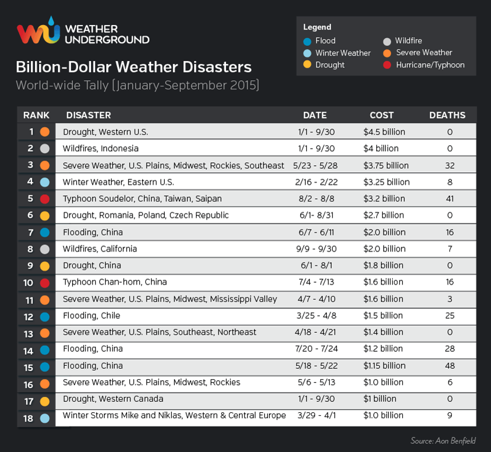 This table, published by the Weather Underground, cites statistics generated by insurance broker Aon Benfield. It shows that this year's record temperatures coincide with 2015, which has seen numerous "billion-dollar weather disasters," all of which were driven by or exacerbated by the climate fluctuations scientists have warned would correspond with increased warming of the world's oceans and atmosphere.