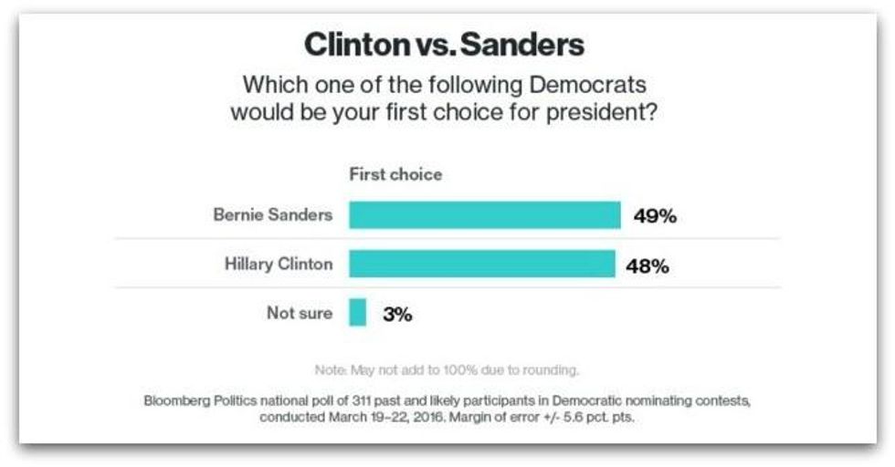 The Bloomberg Politics survey found 49 percent of respondents preferred Sanders, while 48 percent backed Clinton.