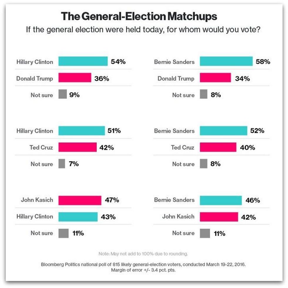 The survey also signaled some trouble for Clinton in holding on to Sanders supporters in November. In general-election match-ups, Sanders holds a 24-point edge over Donald Trump, a 12-point lead over Ted Cruz, and a 4-point advantage over John Kasich among likely general-election voters. Clinton, by contrast, trails Kasich by 4 percentage points. She would carry a sizable lead into a contest against Cruz, where she holds a 9-point advantage, and Trump, whom she beats by 18 points.