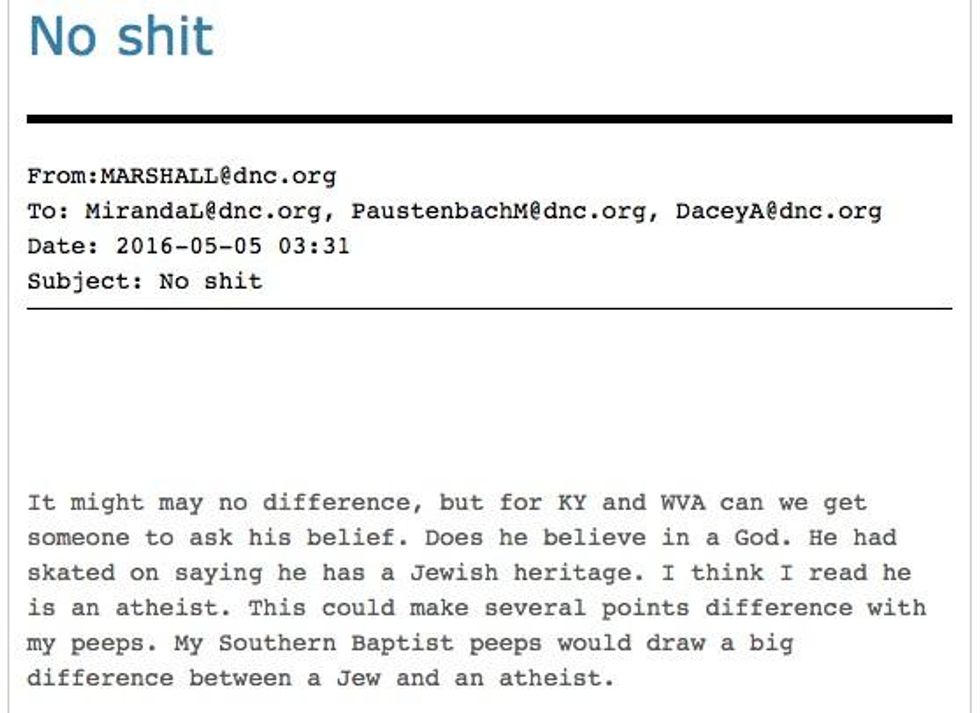 Another email dated May 5, 2016 (Subject Line: No Shit) from DNC Chief Financial Office Brad Marshall appears to show that the DNC sought to focus on Sanders' supposed atheism as a negative point.