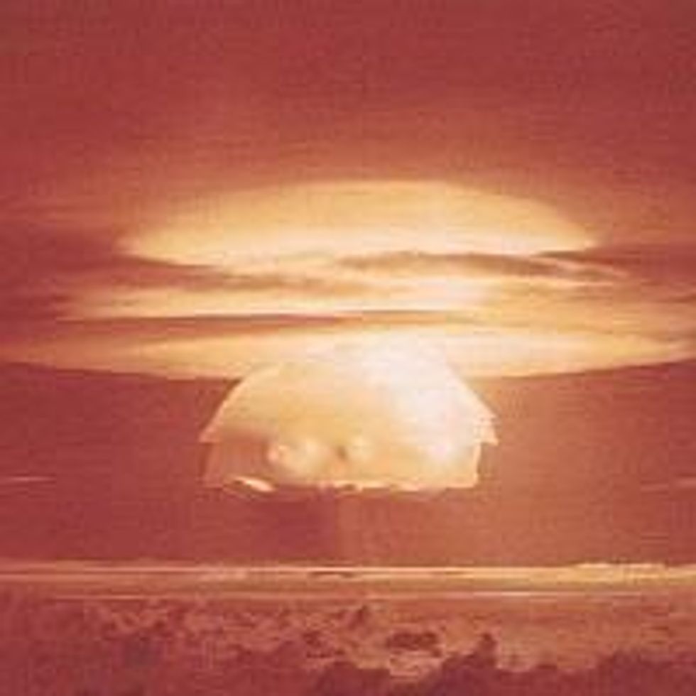 Suddenly a big orange blossom fills the screen, accompanied by ukuleles and lovely -- I mean Strangelovian -- Polynesian music. The blossom is actually Castle Bravo, a 15-megaton hydrogen bomb blast, the largest U.S. test ever, detonated over Bikini Atoll on March 1, 1954.
