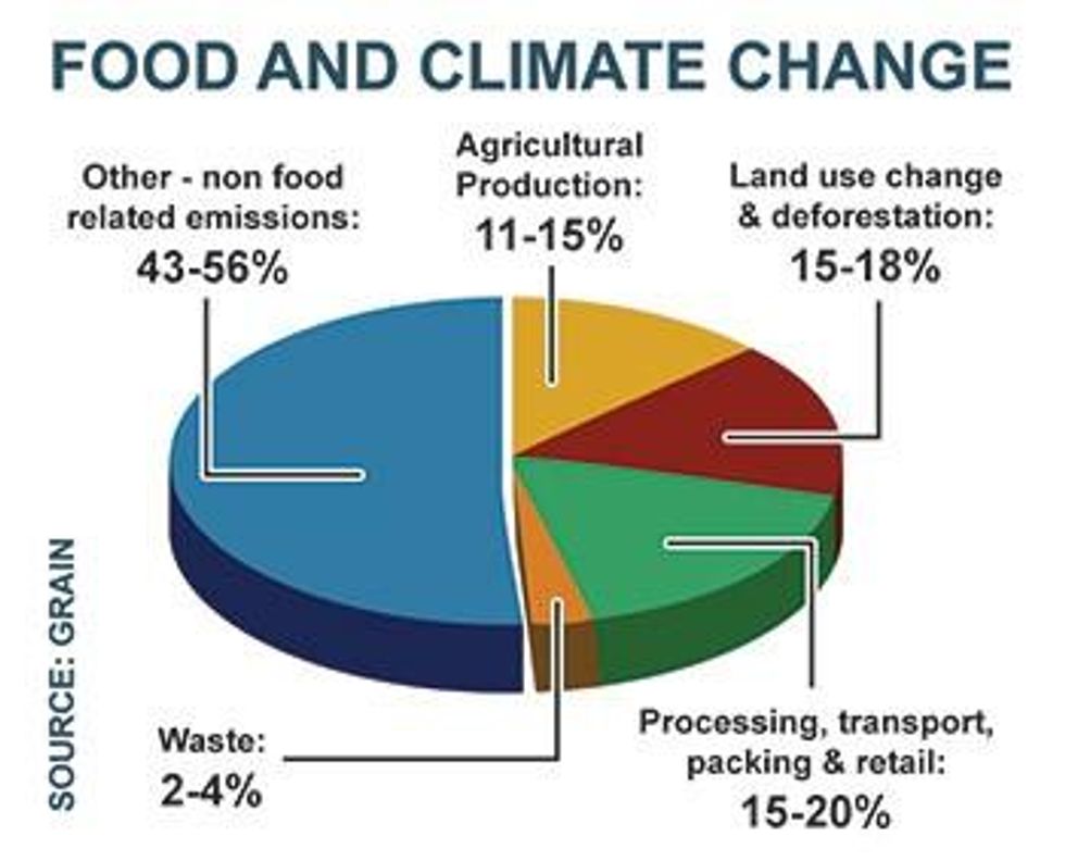 Industrial agriculture is a key driver in the generation of greenhouse gases (GHGs). Synthetic fertilizers, pesticides, heavy machinery, monocultures, land change, deforestation, refrigeration, waste and transportation are all part of a food system that generates significant emissions and contributes greatly to global climate change. Industrial agricultural practices, from Concentrated Animal Feeding Operations (CAFOs) to synthetic fertilizer-intensive corn and soy monocultures, genetically modified to tolerate huge amounts of herbicide, not only contribute considerable amounts of GHGs, but also underpin an inequitable and unhealthy global food system. Modern conventional agriculture is a fossil fuel-based, energy-intensive industry that is aligned with biotech, trade and energy interests, versus farmer and consumers priorities.