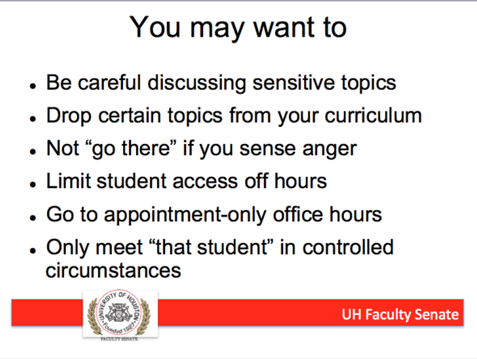 If having armed students seems like it would pretty significantly alter the college classroom, you need look no further than the University of Houston. The university's faculty senate held a meeting recently with a Powerpoint presentation aimed at assisting faculty in adapting to the new gun-toting normal. Here's a slide: