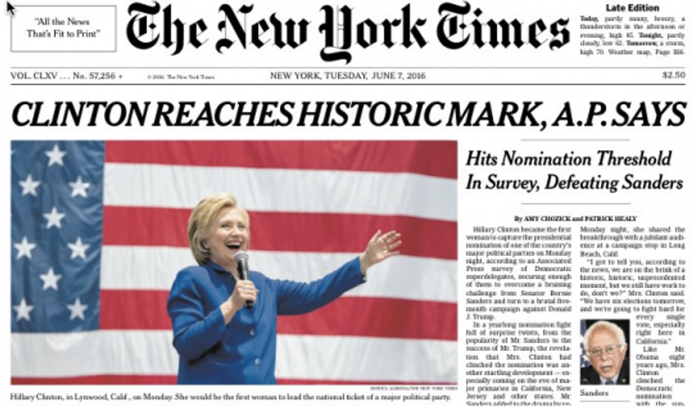 Last night, Associated Press - on a day when nobody voted - surprised everyone by abruptly declaring the Democratic Party primary over and Hillary Clinton the victor. The decree, issued the night before the California primary in which polls show Clinton and Bernie Sanders in a very close race, was based on the media organization's survey of "super-delegates": the Democratic Party's 720 insiders, corporate donors and officials whose votes for the presidential nominee count the same as the actually elected delegates. AP claims that super-delegates who had not previously announced their intentions privately told AP reporters that they intend to vote for Clinton, bringing her over the threshold. AP is concealing the identify of the decisive super-delegates who said this.