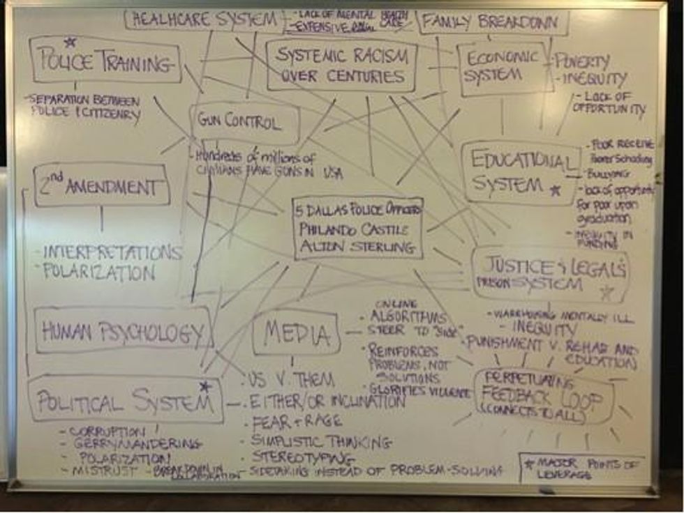 On a white board I visually created a mind map linking the many interconnected systems that contributed to the deaths of two black men at the hands of police officers and the subsequent death of five other police officers. Here's what it looked like: