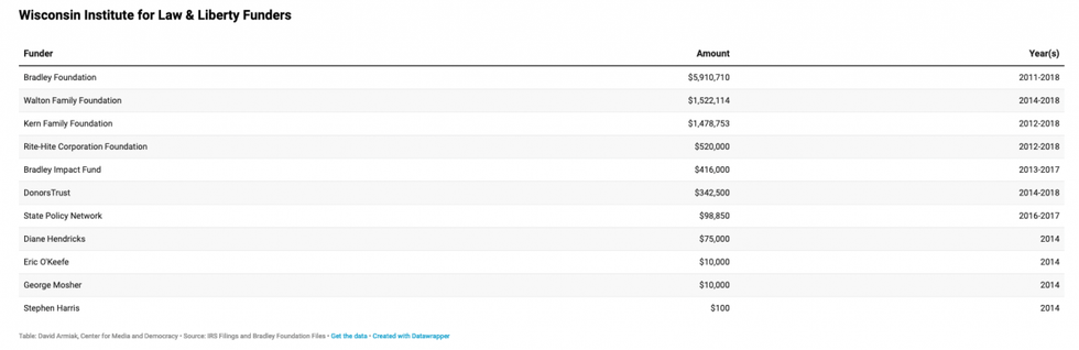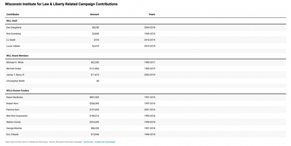WILL, the conservative litigation group leading the charge in Wisconsin, is hardly a neutral player in this strategy. Considered the "MVP" of the right-wing infrastructure built in the state over the past decade, WILL's leaders and funders include many of Wisconsin's heaviest Republican hitters and have collectively poured at least $12 million into the Wisconsin GOP and its candidates over the past two decades.