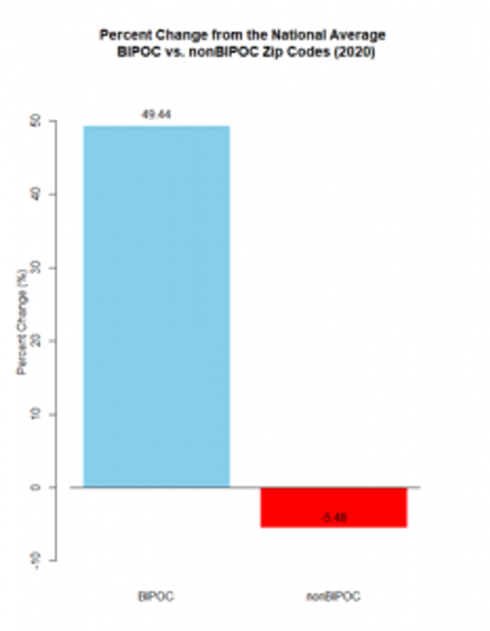 Compared to the national average, mail delay complaints are nearly 50 percent higher in zip codes with populations that are more than 45 percent Black, Indigenous, or other people of color.