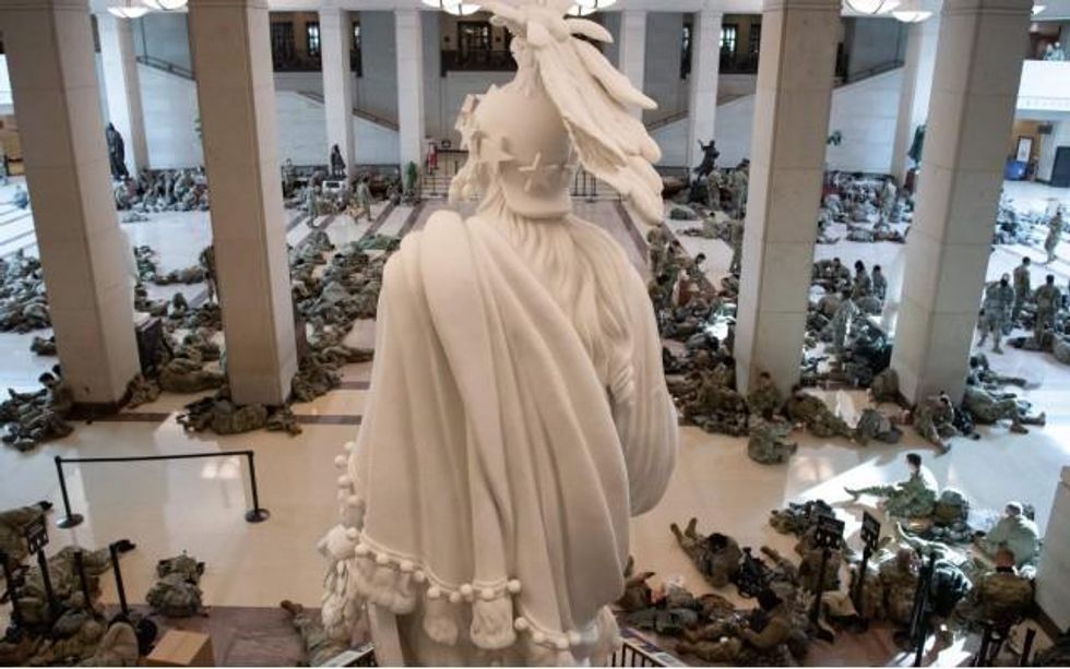National Guard troops protecting the Capitol from more thugs. Many on Twitter blasted those who have "turned Washington into an armed camp instead of a celebration of democracy," charging, "The stink of what you've done will never wear off." Photo by Saul Loeb/AP