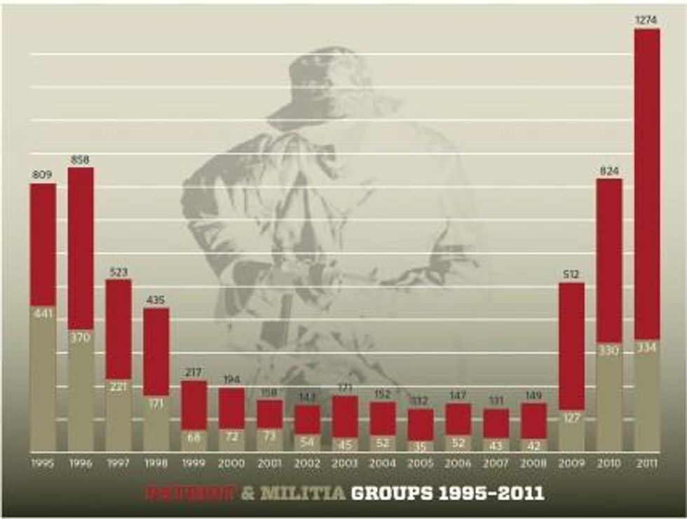 Fueled by superheated fears generated by economic dislocation, a proliferation of demonizing conspiracy theories, and the reality of an African-American president in Barack Obama, radical hates groups and antigovernment groups grew explosively in 2011, according to a new report by the Southern Poverty Law Center. This year's report, The Year in Hate and Extremism (pdf), follows past work where the SPLC catalogs the number of 'hate groups' and other radical rightwing movements in the US and gauges their motivations and the size of their membership.