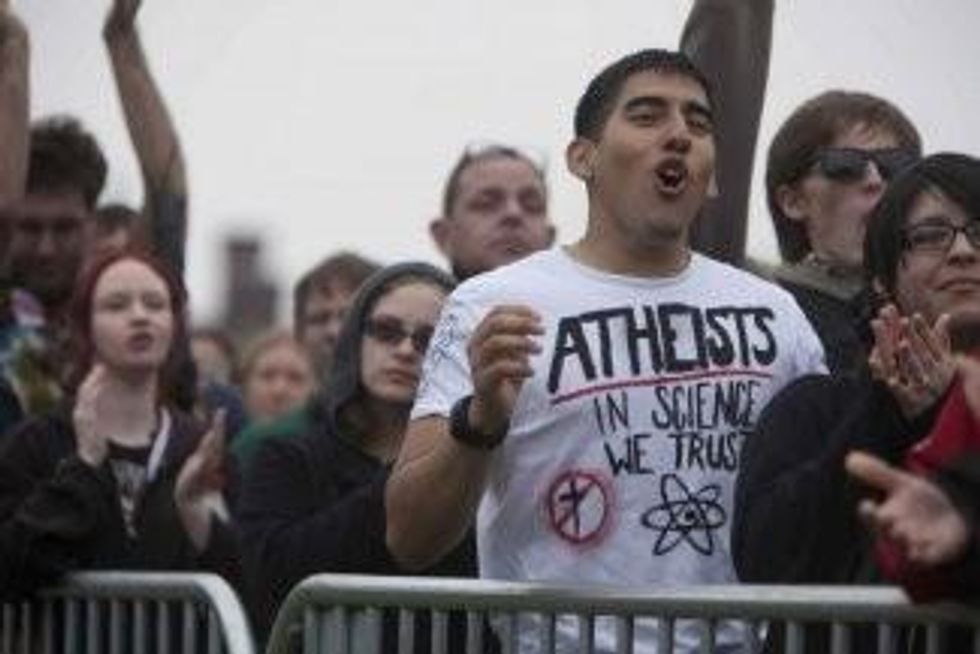 "We are here to celebrate our belief in reason, science and the power of the human mind," comedian Paul Provenza said from the podium as raindrops fell. "We are here to say to elected politicians ... that there is a base for them to stand on to stand up to the religious right."