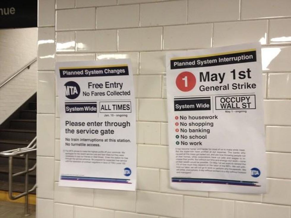 A press release claiming credit for the action said it was carried out by activists affiliated with Occupy Wall Street, as well as by rank-and-file members of Transit Workers Union Local 100, which is currently in negotiations with the Metropolitan Transit Authority.