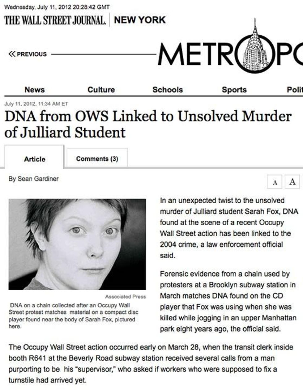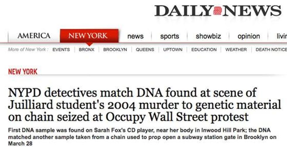 NBC New York reported, "forensic evidence from the 2004 murder scene of a Juilliard student" named Sarah Fox has been linked to "the scene of recent Occupy Wall Street subway vandalism." DNA on a CD player found at the crime scene matches "DNA found on a chain left by Occupy Wall Street protesters at the Beverly Road subway station in East Flatbush on March 28, 2012."