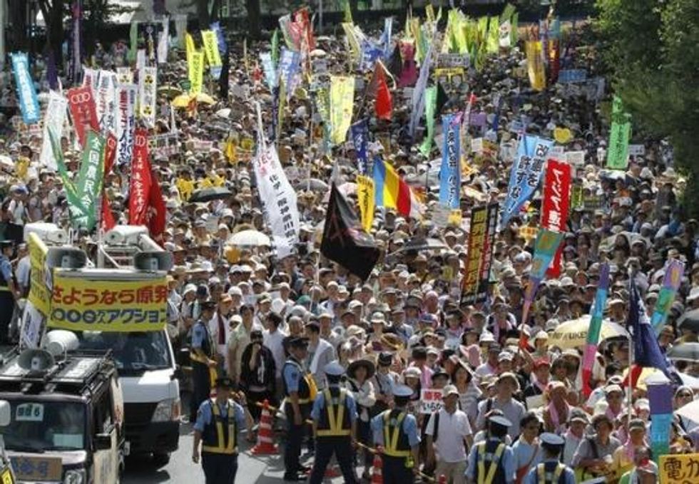 Protest organizers estimated the crowd at 170,000 people. Demonstrators marched through the streets in Tokyo's record setting heat chanting: "Don't resume nuclear power operation. Prime Minister (Yoshihiko) Noda should quit."