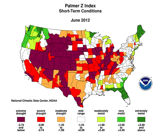 The 2012 drought disaster is now the largest in over 50 years, and among the ten largest of the past century, according to a new report released by the National Climatic Data Center today.
