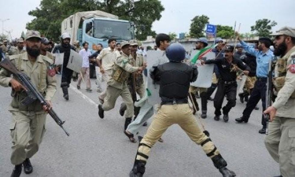 Police in Islamabad set up barricades and razor wire to prevent protesters from getting to the diplomatic enclave, where the U.S. Embassy and many other foreign missions are located. Protests were also held in Karachi, Peshawar and Lahore, where protesters shouted "Down with America" and some burned the U.S. flag. About 200 policemen and barbed wire ringed the U.S. Consulate in Lahore.