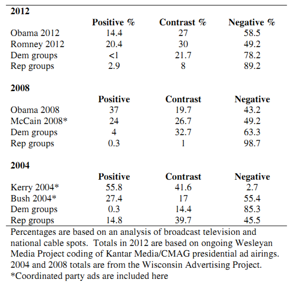 One of the dominant features of the 2012 election has been the increase in negativity. This is apparent when you break down tone by sponsor over different points in the presidential general election. Table 5 shows tone of ads by candidates and outside groups in the first three weeks of October in 2012.