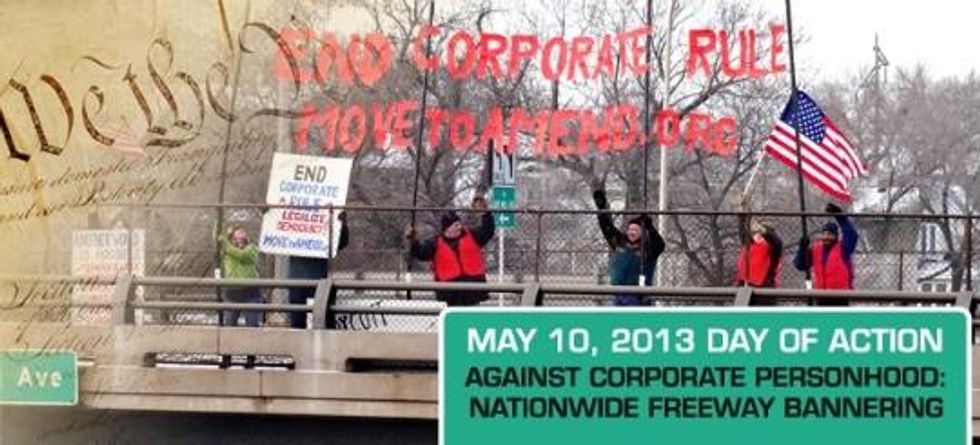 Activists in 77 cities will be rising up against "corporate rule and political corruption" and volunteers with organizing group Move to Amend will be hanging freeway banners to rally passersby behind their call for a constitutional amendment to overrule Citizen's United.