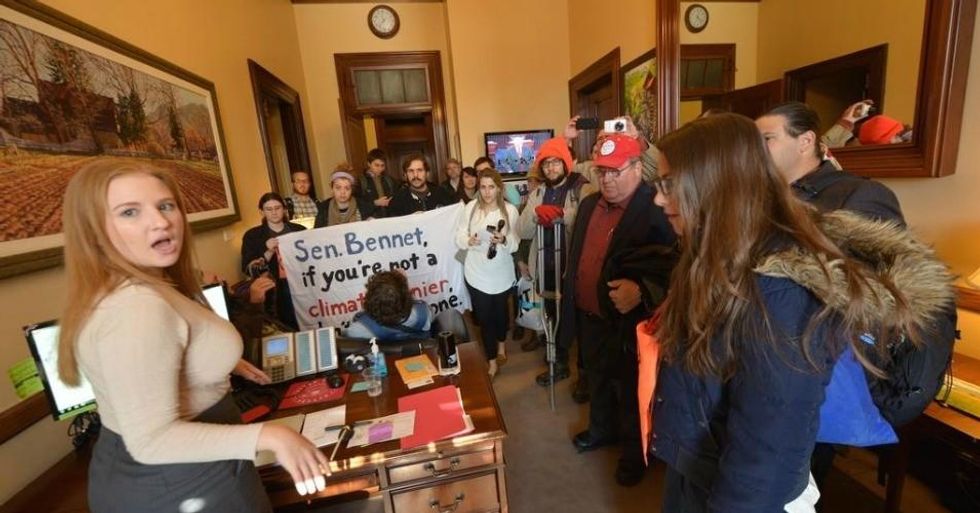 According to reports, students were arrested for blockading the office of U.S. Senator Tom Carper (Del.), where they sang and brandished a banner that read: "Sen. Carper, if you're not a climate denier, don't vote like one."