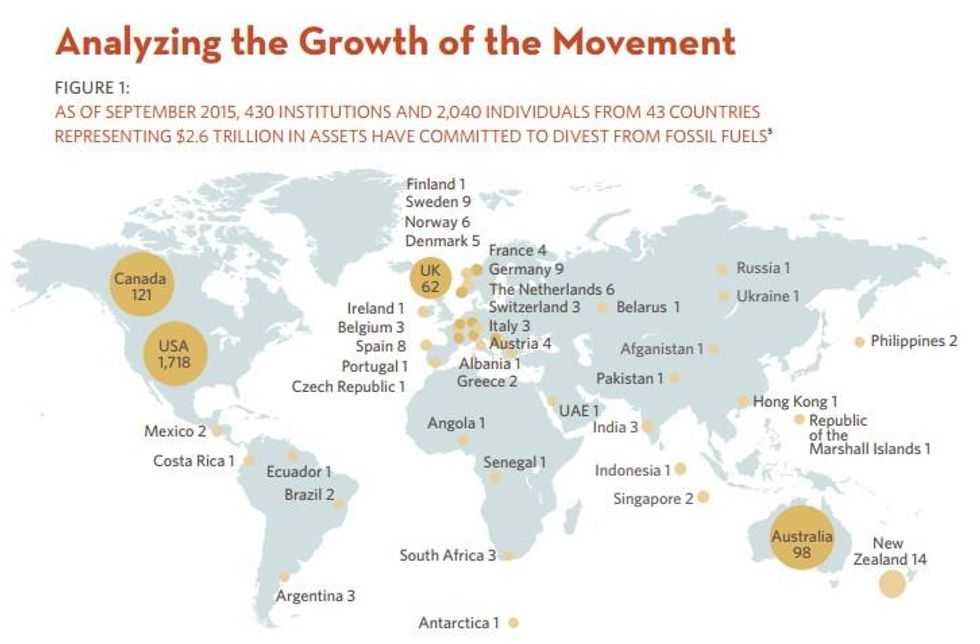 - While historically focused in the United States, the divestment movement now spans the globe. In 2014, 78 percent of divesting institutions were US-based. Today, 57 percent are US-based. Institutions that have chosen to divest represent more than 646 million individuals around the world.