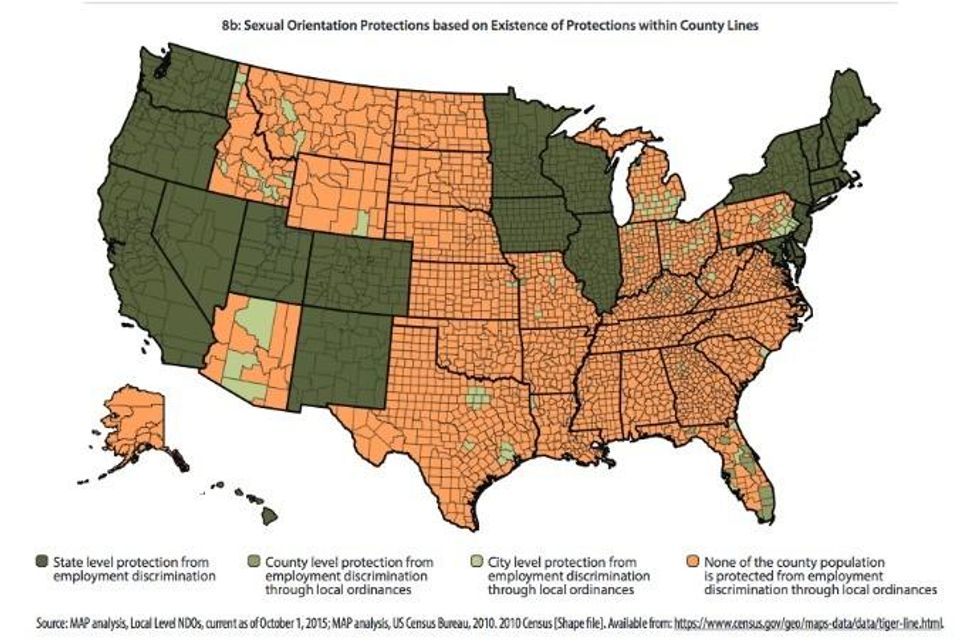 Nineteen states have enacted workplace protections and, combining the coverage provided by those and other local NDOs, currently, "more than 170 million Americans are living in areas with laws that explicitly protect them from being fired based on their sexual orientation, and more than 157 million are explicitly protected from discrimination based on their gender identity," according to the MAP study.
