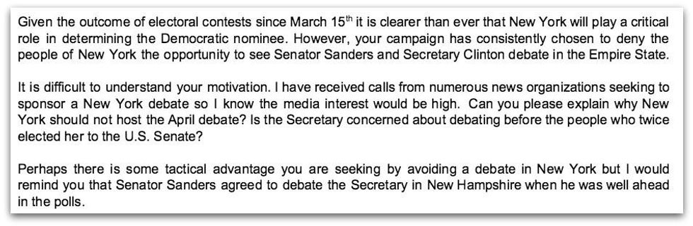 Later on Sunday, Sanders' campaign manager Jeff Weaver sent a letter (pdf) to his counterpart in the Clinton campaign, Robby Mook, laying out the argument for why a debate would be in the best interest of voters and reminding Mook that the two campaigns had agreed to "three additional debates - one in March, one in April, one in May - in return for our campaign agreeing to the late scheduled debate in New Hampshire prior to that state's primary."