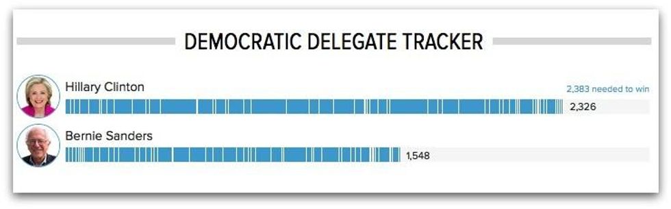 As of Saturday afternoon, according to Associated Press figures, Sanders trailed Clinton in pledged delegates by a tally of 1,769 to 1,501 -- a difference of 268. Meanwhile, among the superdelegates--elected and party officials who automatically attend the convention where they vote for the candidate of their choice--Clinton has the stated support of 547 of them, compared to 46 who at this point say they back Sanders. Importantly, however, none of these superdelegates have actually "voted" and they can change their minds at any point until casting their ballot at the convention.