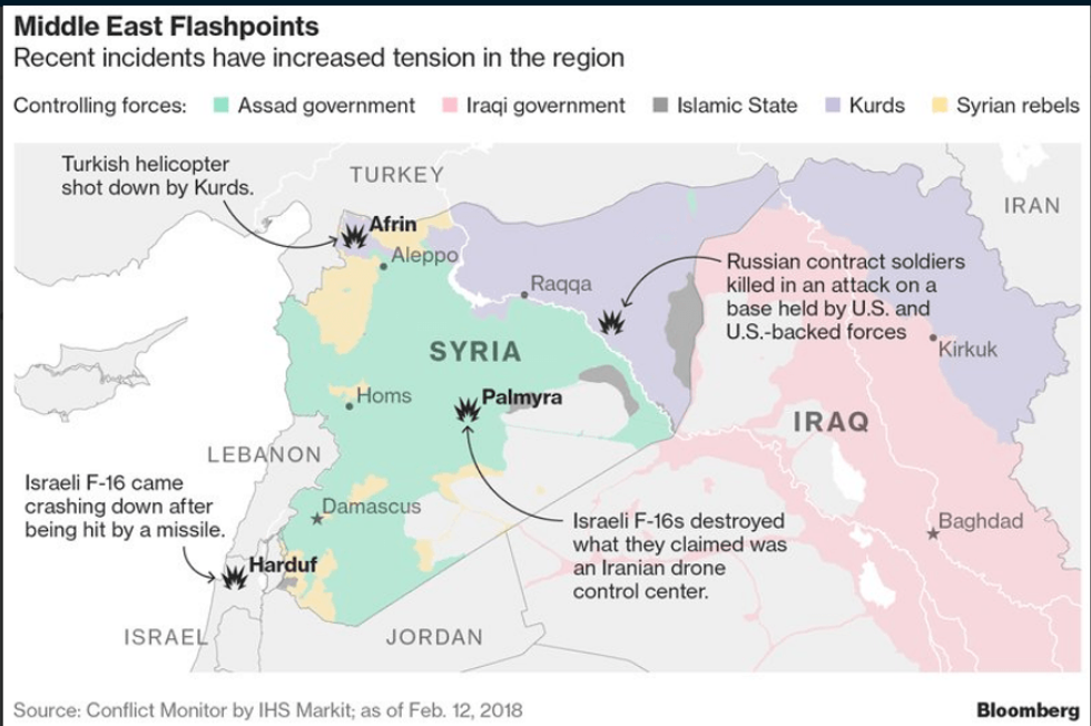 In a graphic, Bloomberg highlighted several recent incidents that have contributed to soaring tensions in Syria, including recent Israeli airstrikes in the country.