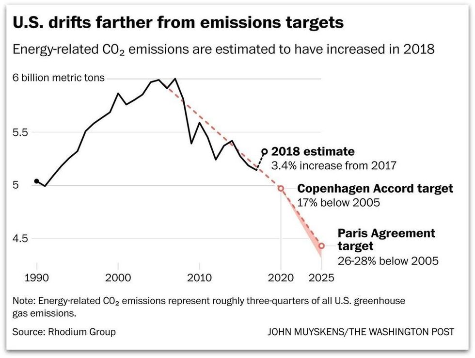 According to the Guardian, the jump in 2018 "is the biggest since the bounce back from the recession in 2010. It is the second largest gain in more than two decades." While Trump has ended U.S. support for the U.N.-backed Paris climate agreement, the new figures show just how far the country is now from the original commitment it made when Obama backed the deal in the second term of his presidency.
