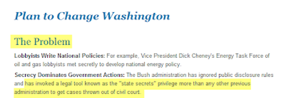 From the Obama/Biden campaign website, mybarackobama.com, here was what the Obama campaign was saying -- back then -- about the State Secrets privilege: