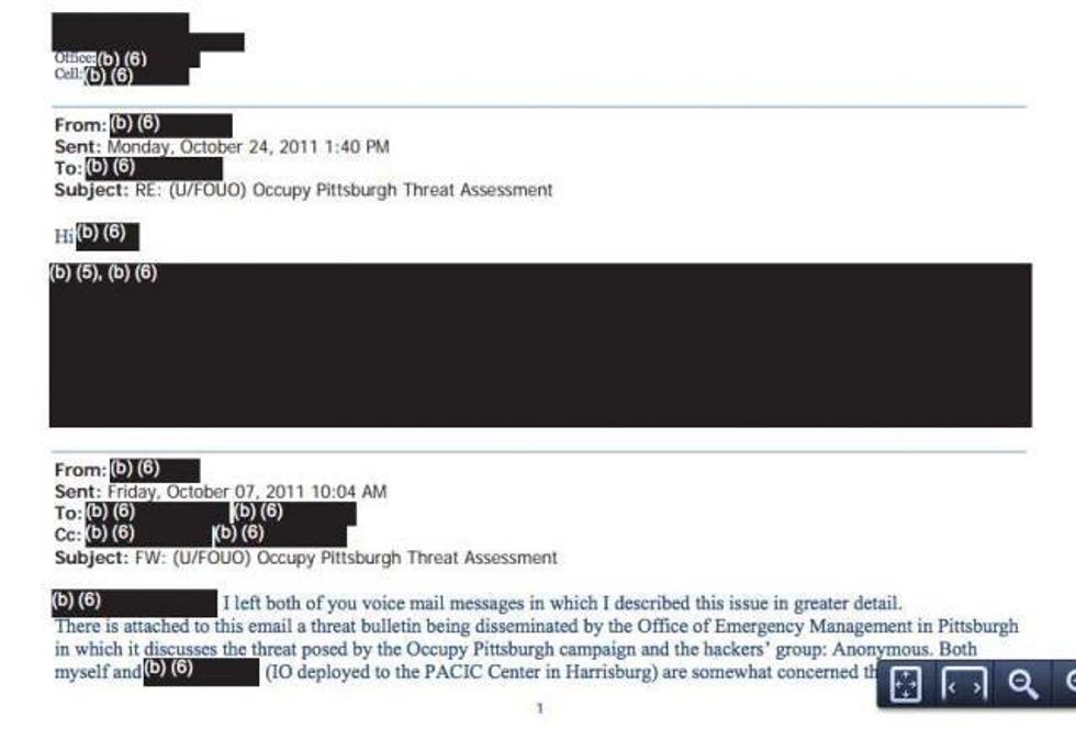 Also suspicious is an email exchange dated September 29, 2011, in which DHS officials are discussing a National Cybersecurity and Communications Integration Center alert, based apparently on monitoring of email, twitter and Facebook communications among Occupy organizers, of the coming Occupy actions. The exchange is about how to respond to inevitable media inquiries about the DHS's role in monitoring and obstructing the Occupy movement. The whole discussion is redacted from the documents, though one participant is shown writing "Here it is. That answer works."
