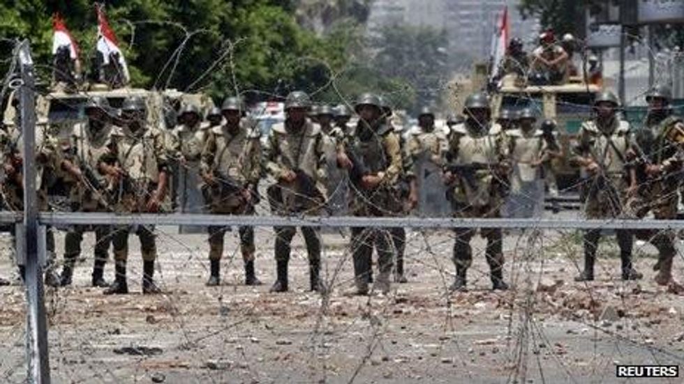 There were two narratives about what happened. The army maintained that armed individuals tried to raid the military barracks, where they think deposed President Muhammad Morsi is being held. In this telling, there was an attempted violent jailbreak by Morsi's militant followers, which the troops fought off, returning fire. The army said that an officer was killed and 40 military men were wounded in the "terrorist attack."