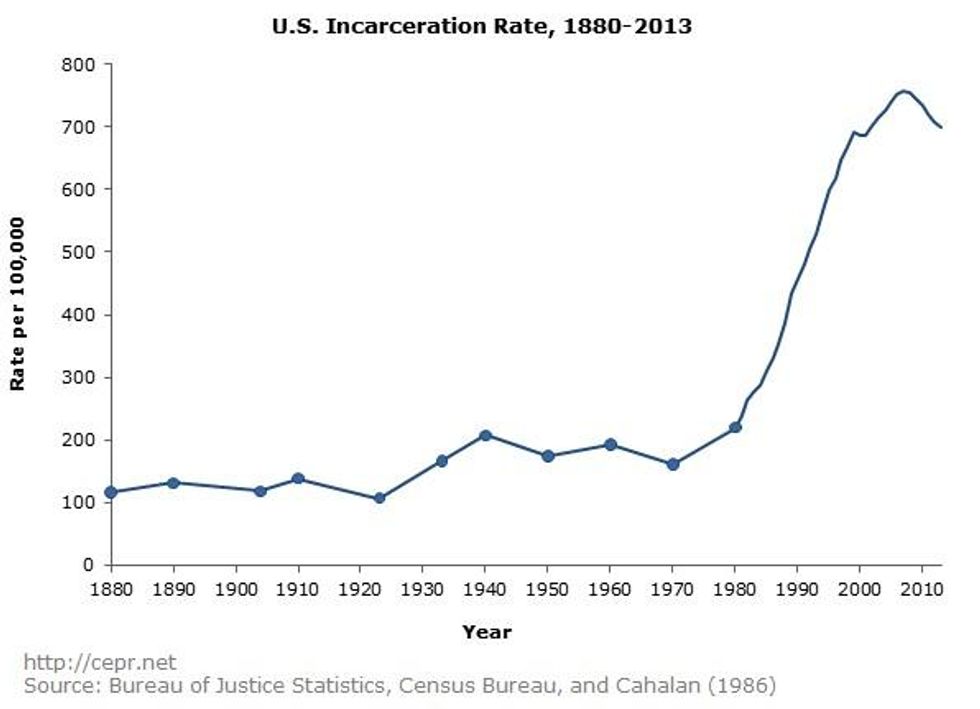 As President Obama and others have mentioned, the incarceration rate has fallen over the past few years. After almost 30 years of steady increases, the incarceration rate peaked at 757.7 in 2007, and fell to 698.7 by the end of 2013.[i] This is certainly promising news, especially if this trend continues.