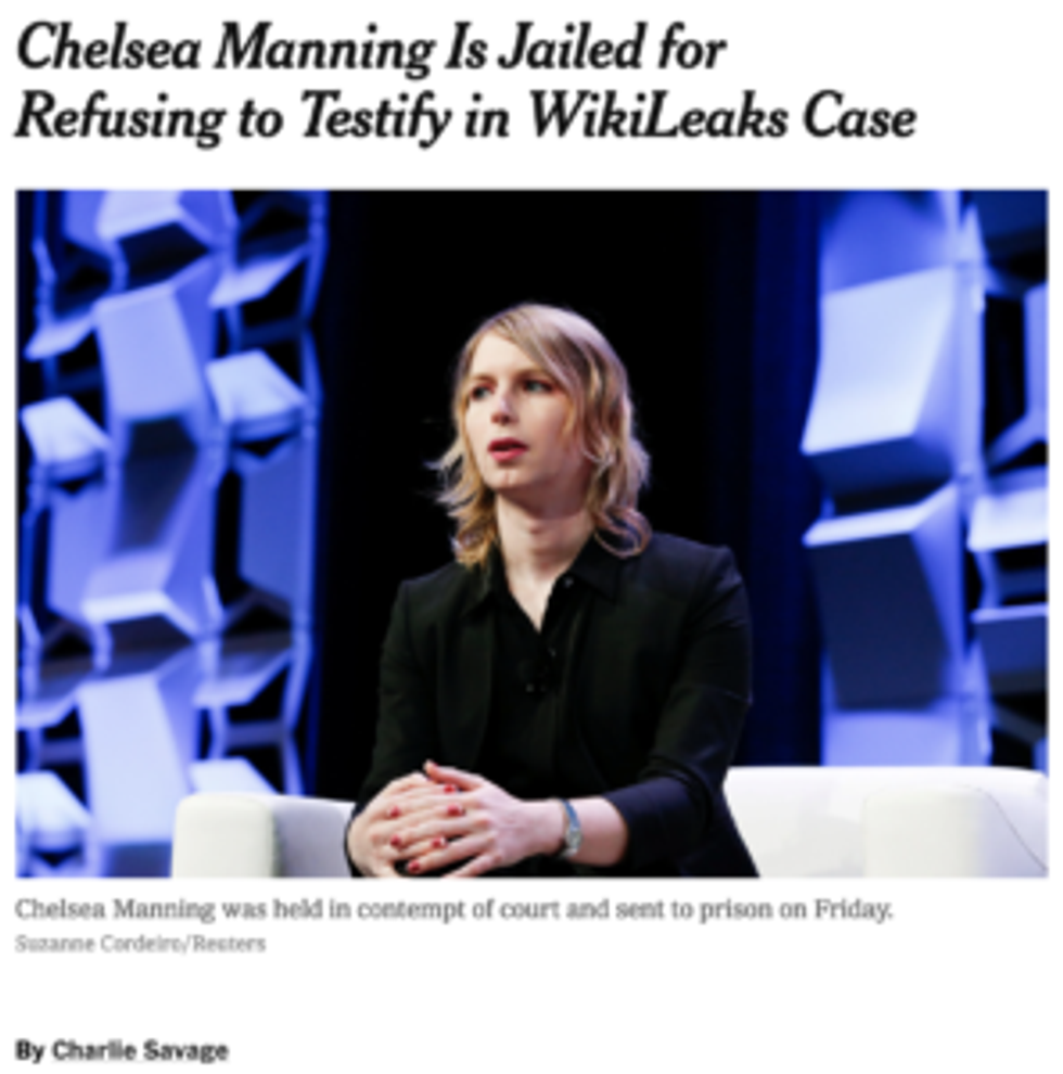 Manning has recently been subpoenaed by a grand jury, widely understood to be attempting a case against Assange, though as a grand jury it's all very secretive, and asked to testify again about her 2010 public disclosures. She refused, citing the very secretiveness of the process, and noting that she had already testified fully about the reasons for her disclosures, that they were her choices alone, and not solicited by Assange or anyone else. A judge then ordered her incarcerated until she agrees to testify or until the jury is done, which might be 18 months.