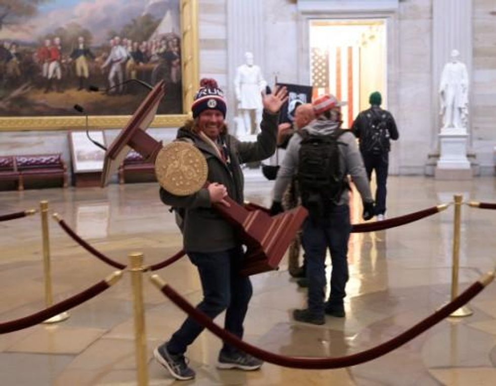 Taking a stand. New social media star Adam Johnson of Florida hauls off Pelosi's lectern. Photo by Win McNamee/Getty Image