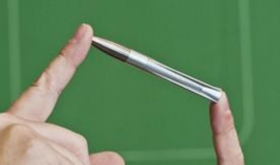 The bullet flies straight due to its aerodynamically stable design, which consists of a center of gravity that sits forward in the projectile and tiny fins that enable it to fly without spin, just as a dart does, he said.