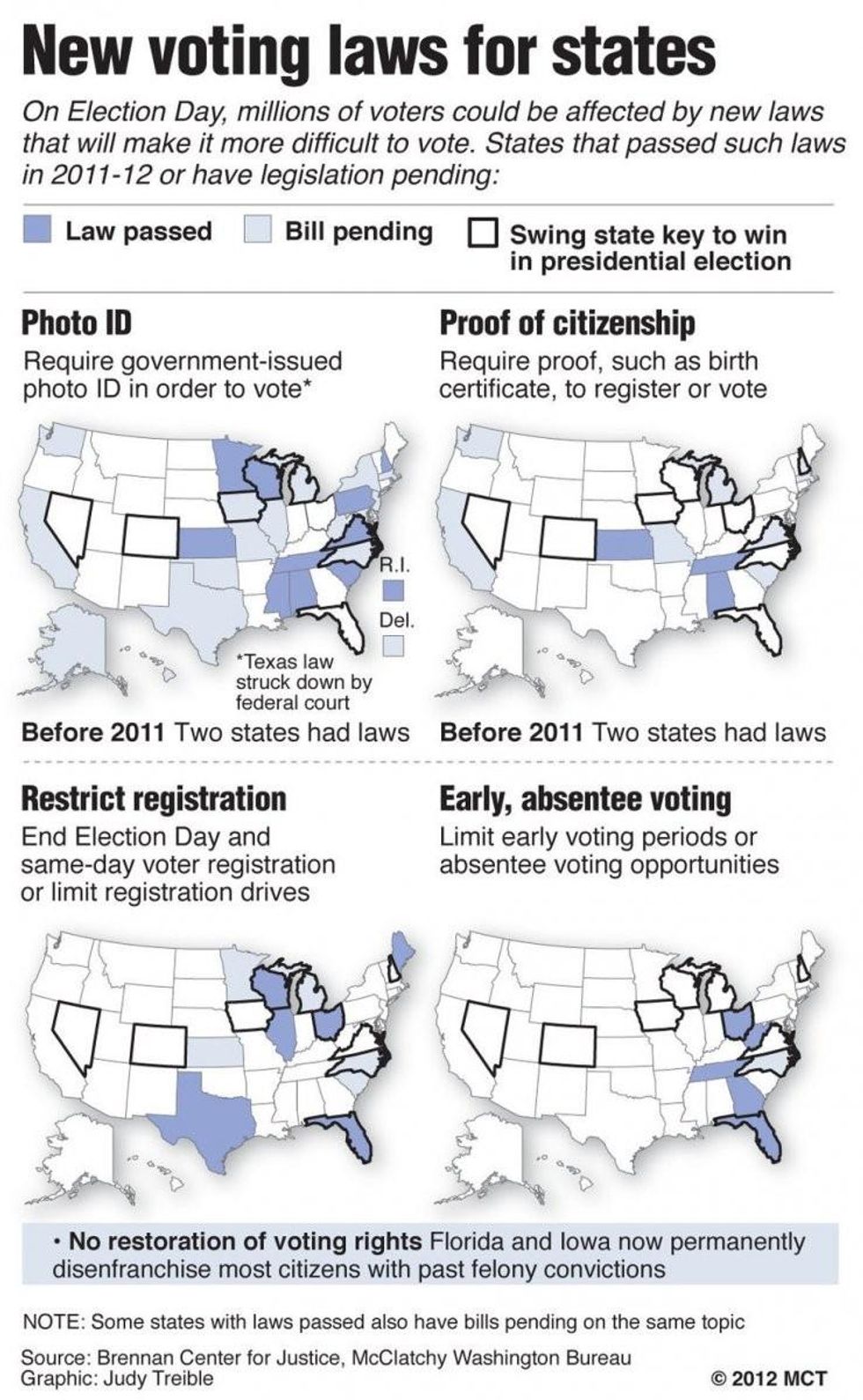 Since 2011, nine states have passed laws requiring voters to show government-issued photo ID at the polls, with five others now restricting early voting and three more requiring proof of citizenship such as a birth certificate.