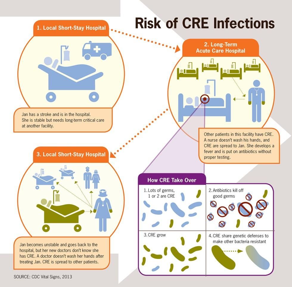 Enterobacteriaceae germs (E. coli is an example) normally exist in the gut, but can become resistant to carbapenems, known as "last resort antibiotics." The germs may then travel to areas in the body they don't normally exist, often striking patients in hospitals and nursing homes on ventilators or catheters.
