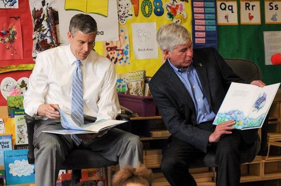 Of course, the irony is that Secretary Duncan was in Michigan to review Snyder's education initiative--called the Education Achievement Authority (EAA)--which its critics say is quickly destroying the public education system in the state under the guise of the same "corporate reform" model which Duncan himself has championed inside Obama's Department of Education and during his tenure as head of Chicago's public schools.
