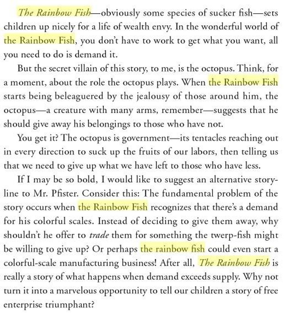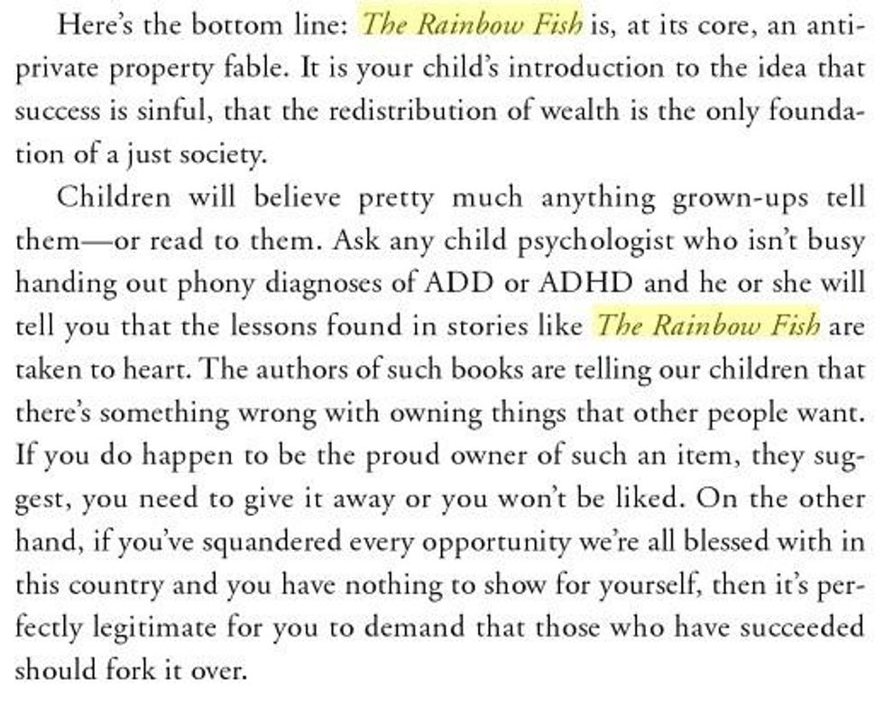 The book, of course, is just about a pretty fish who receives a valuable lesson about sharing with others after a little chit-chat with a friendly octopus. But if rightwing nuts like radio personality Neal Boortz are to be believed, the true threat of the book that Snyder and Duncan used to captivate the youngsters is not easily seen at first sight.Following its publication in the 1990s the book's seemingly innocuous plotline generated wild conspiracy theories about how the story of the glimmering fish would brainwash children into thinking that private property and individualism were crimes, turning a generation into raving Bolsheviks who would grow up to destroy the "free market".