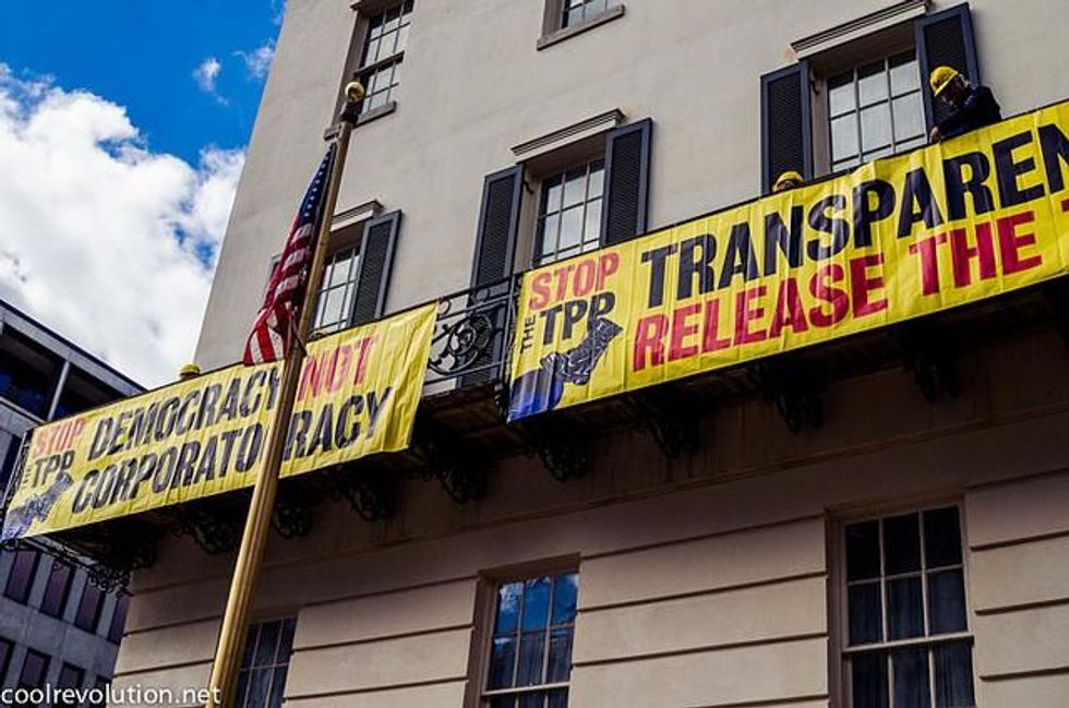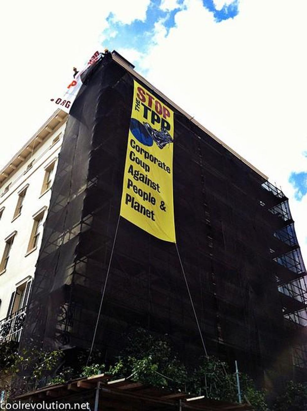 Protesters scaled the Office of the U.S. Trade Representative on Monday and dropped banners calling for greater transparency and an end to "corporatocracy" over the ongoing and secretive Trans-Pacific Partnership trade agreement currently in the works between the United States and several Pacific nations.