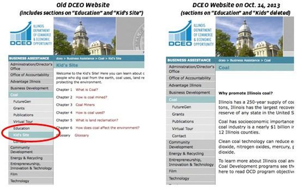 Two sections that essentially told kids that coal was safe and good for the environment disappeared today from the website of a state agency in Illinois.