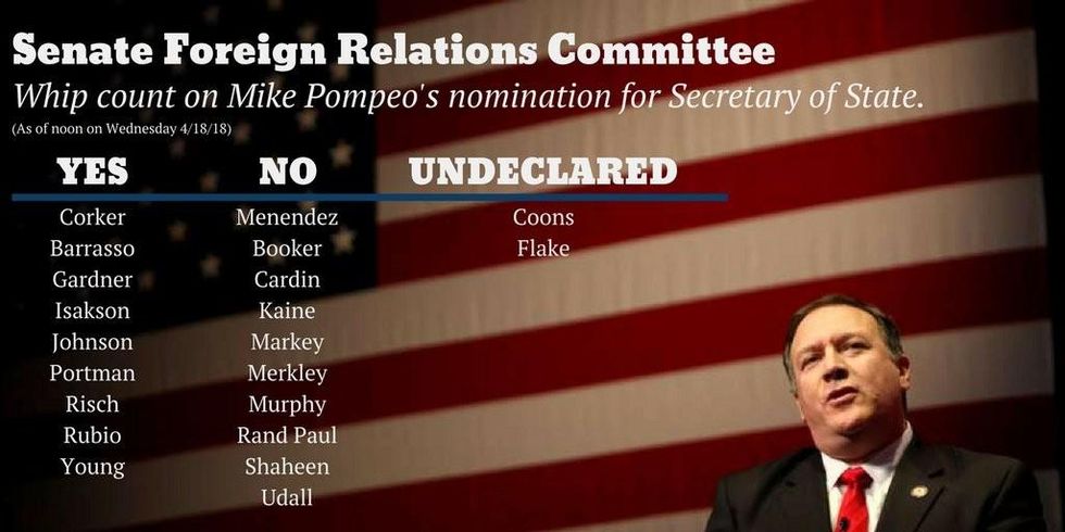 While 18 senators have vowed to vote against Pompeo as of this writing--Win Without War provides a full whip count here--27 Democrats and Sen. Angus King (I-Maine) have yet to state publicly whether they will oppose Pompeo's confirmation: