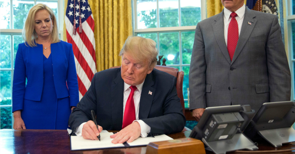 While Trump insisted during remarks to reporters on Wednesday that he decided to sign the executive order--which was drafted by DHS Secretary Kirstjen Nielsen--because he has "compassion" for immigrant children, the order does absolutely nothing to reunite the thousands of families that the White House has already separated and continues the administration's so-called "zero tolerance" policy.