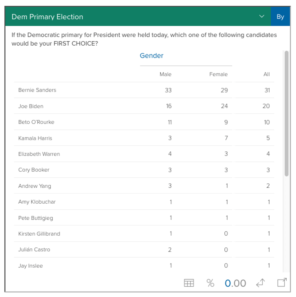 Sen. Kamala Harris (5%), Sen. Elizabeth Warren (4%), Sen. Cory Booker (3%), Andrew Yang (2%), Mayor Pete Buttigieg (1%), former Sec. Julian Castro (1%), Rep. Tulsi Gabbard (1%), Sen. Kirsten Gillibrand (1%), Gov. Jay Inslee (1%) and Sen. Amy Klobuchar (1%). Several other candidates polled at less than one percent at this early stage.