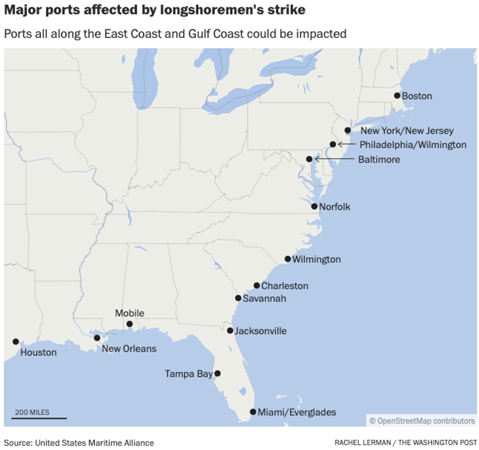 The strike is expected to have consequences across the economy: East and Gulf Coast ports bring in about half of the country's containerized goods and send out about two-thirds of them.