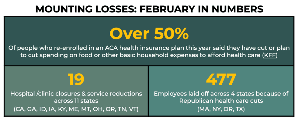 "Republicans ransacked $1 trillion from Medicaid, and then they more than doubled premiums for over 20 million Americans in order to fund tax breaks for billionaires and big corporations," Leslie Dach, chair of the advocacy group Protect Our Care, said in a statement last week. "Now, care for 15 million working Americans will be ripped away, nursing homes and hospitals are on the chopping block nationwide, and Americans are buried under skyrocketing healthcare hikes."