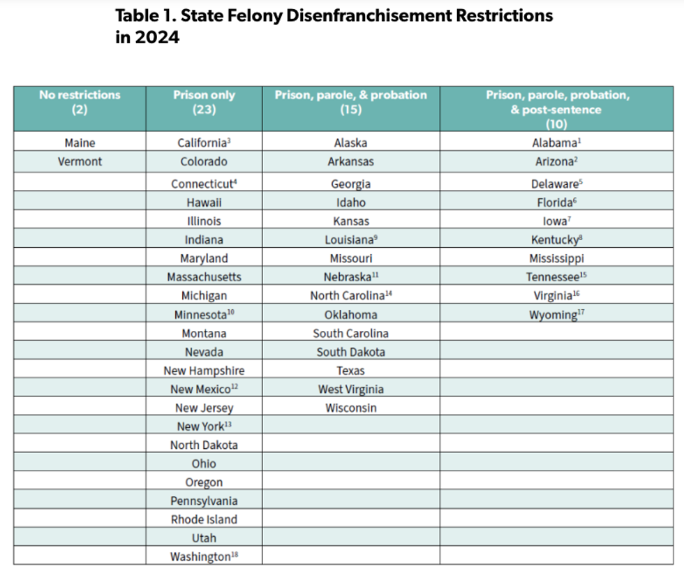 "Felony disenfranchisement echoes policies of the past, like poll taxes and literacy tests," she added. "Felony voting bans keep communities that have been historically unheard and under-resourced from having equal representation in our democracy. It's time to guarantee voting rights for all, including those with felony convictions, to create a truly inclusive democracy."